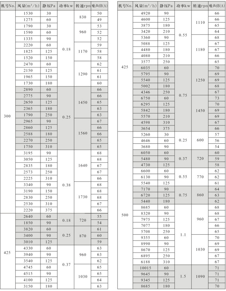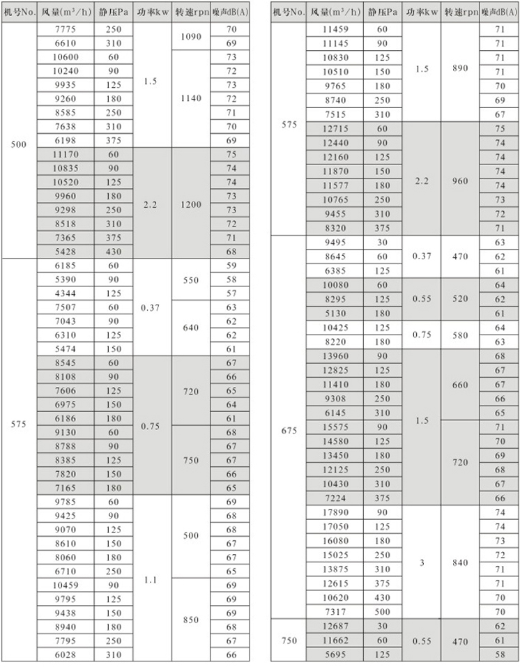 本系列风机叶轮、电机机号按叶轮直径分有300、425、500、575、675、750、900、1000,共8种规格,风量自1275m3/h至55215m3/h,最高静压达650Pa。