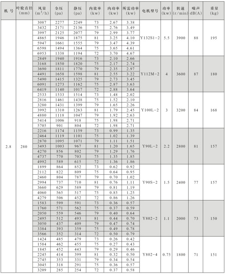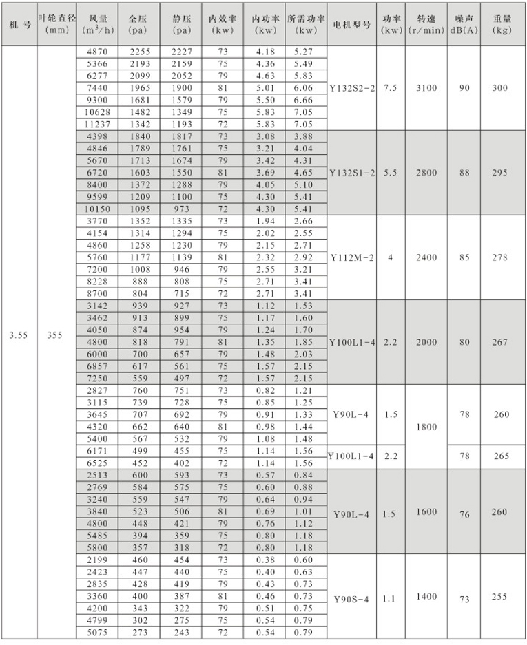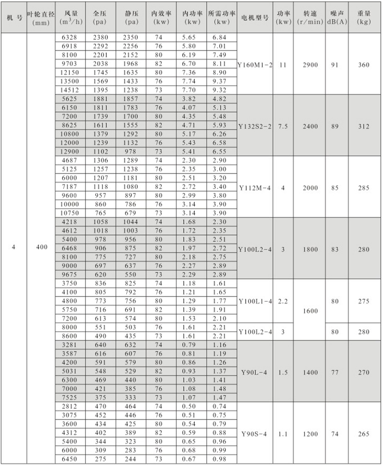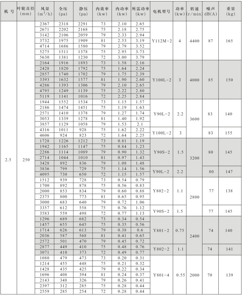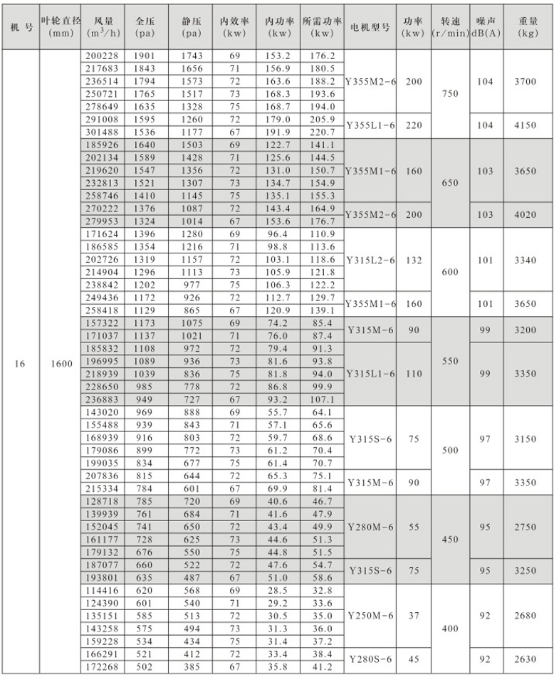 风机按直径分为250~1600mm十七种规格,系列风量为1000~300000m3/h,全压为280~2300Pa。风机分单速和双速,双速风机配用双速电机,实现两档调速,可满足用户对不同工况点性能调节的需要,风机也可配用变频电机和变频控制器,实现变频调速,建议调节频率锁定在25Hz~50Hz。