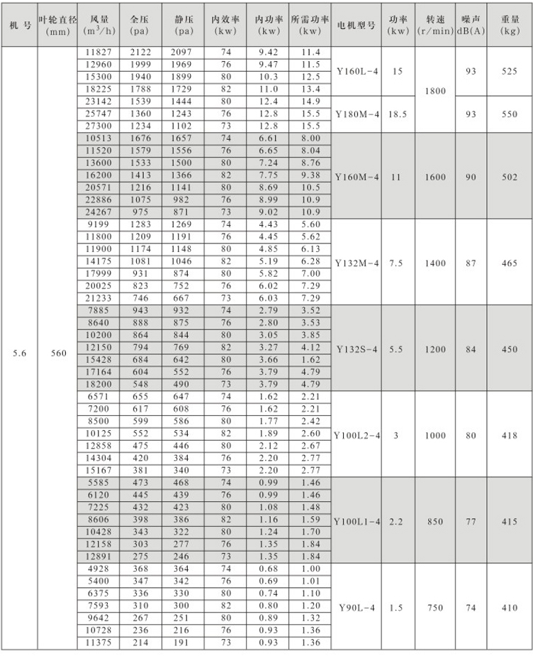 风机叶轮、机壳为优质钢板,全部模具生产,采用焊接成形,叶轮经静、动平衡校正,其平衡精度不大于5.6级。