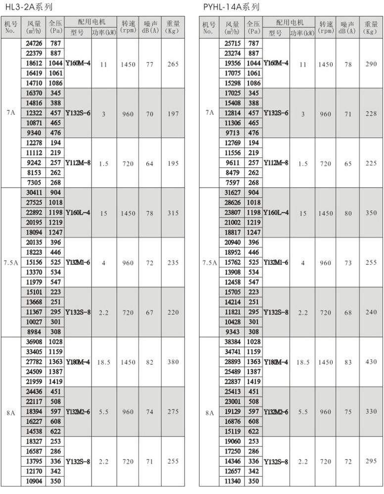 HL3-2A系列混流风机,PYHL-14A系列混流排烟风机性能参数表(7)